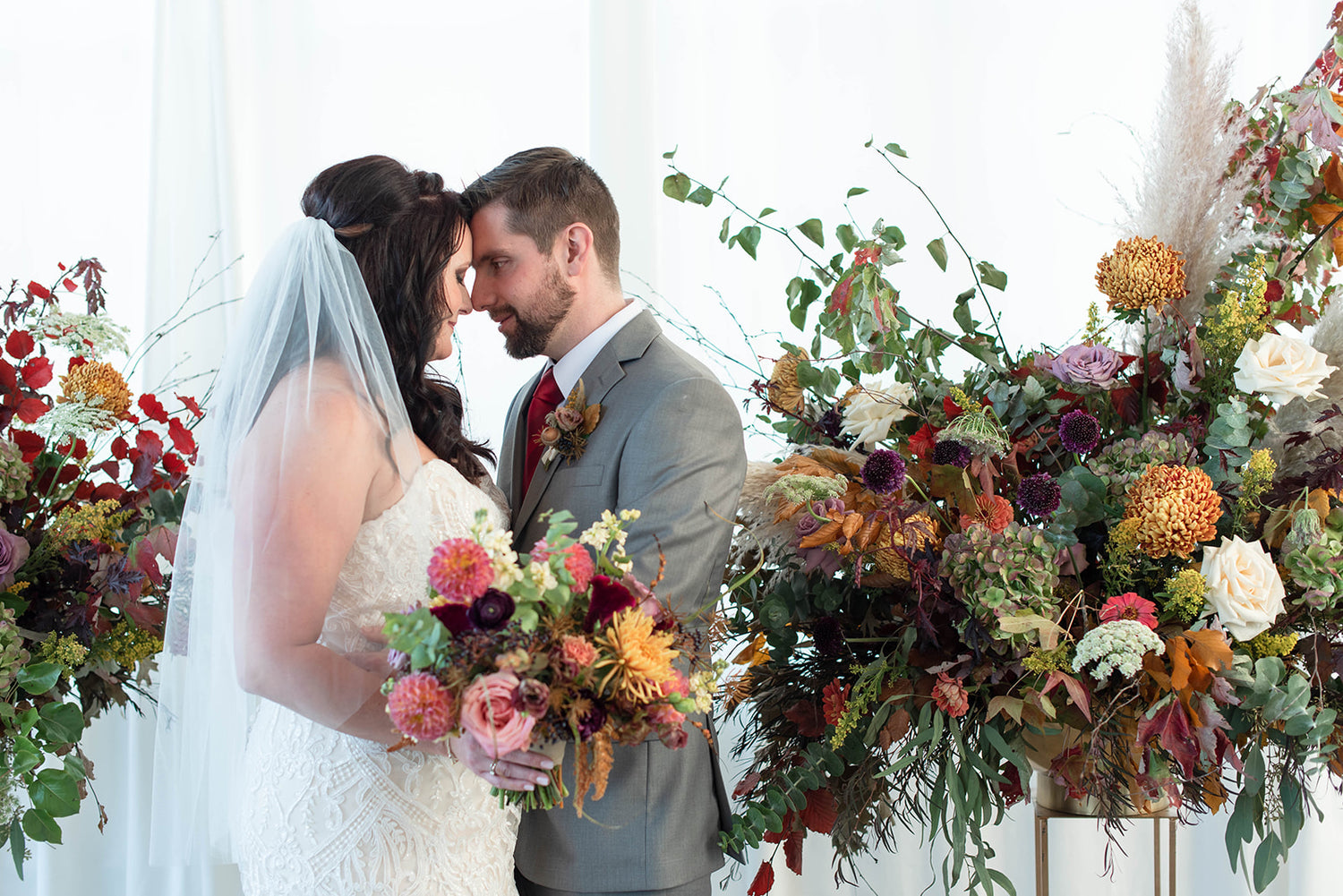 Fall brings crisp air and golden hour light. The changing season produces stunning garden roses, dahlias, amaranthus, and dried grasses. These combined with Fall foliage create palettes of amber and russet, rich reds, fiery oranges and beautiful yellows mixed with greens and browns. We will translate the beauty of Autumn into your wedding!