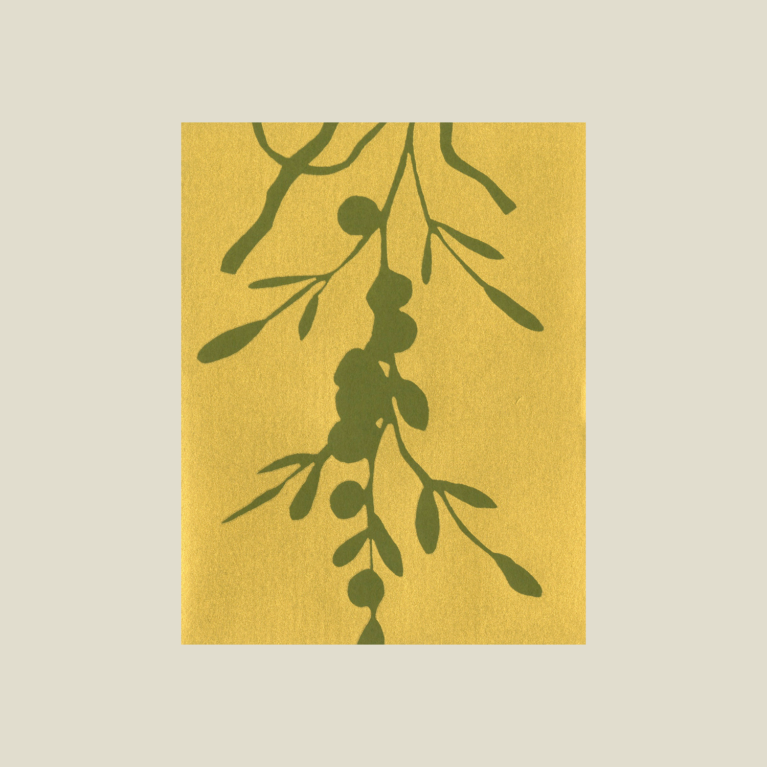 This card is hand silk-screened with gold ink on 100# French’s recycled Factory Green Construction cover, and comes with a white envelope.