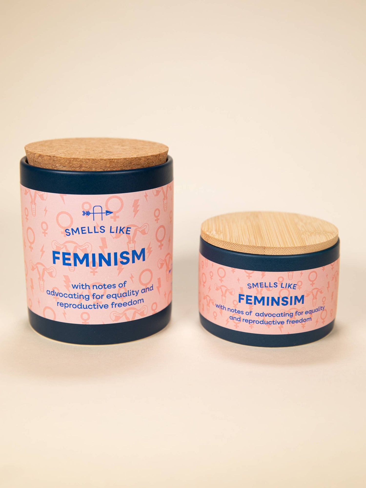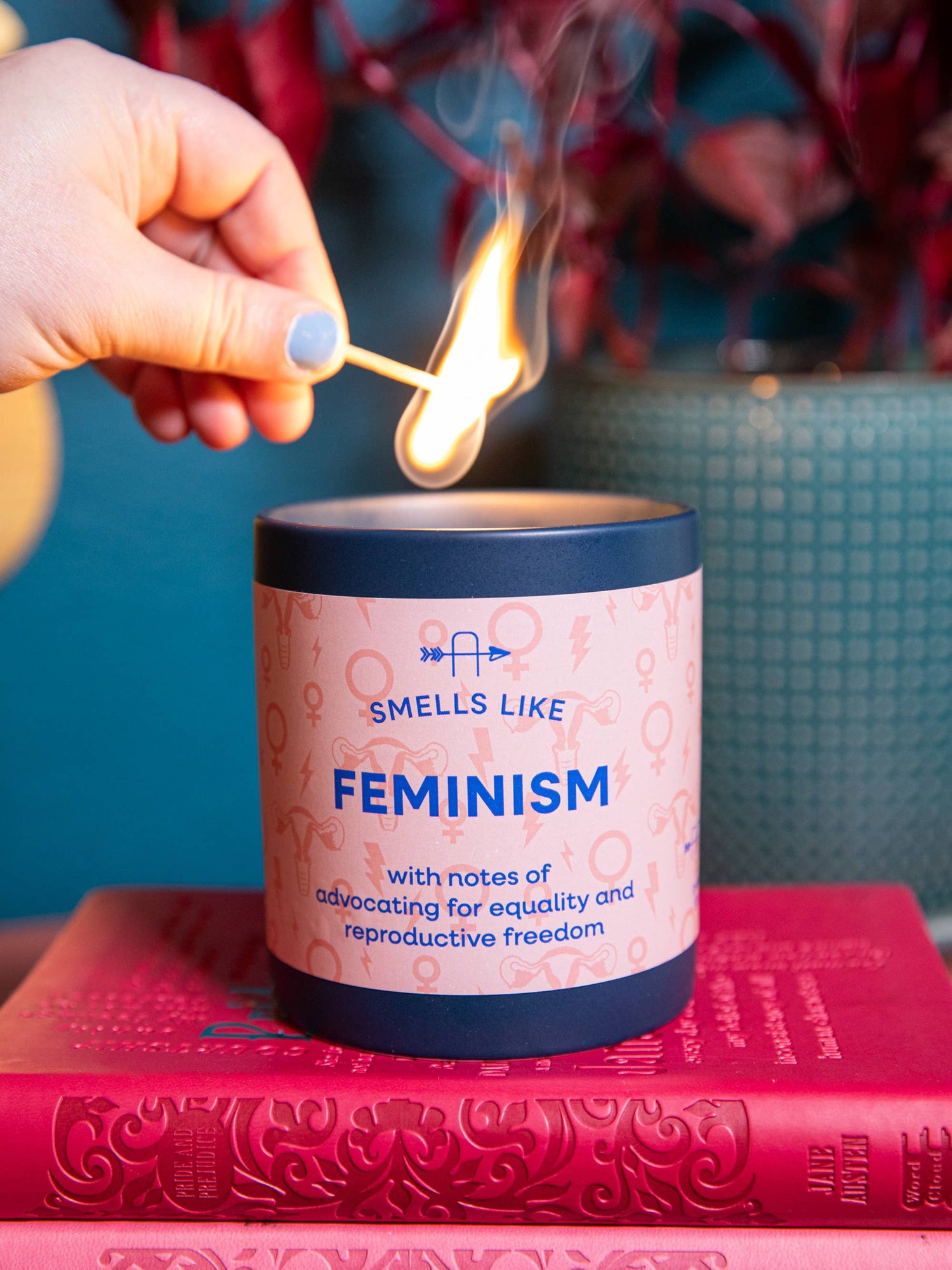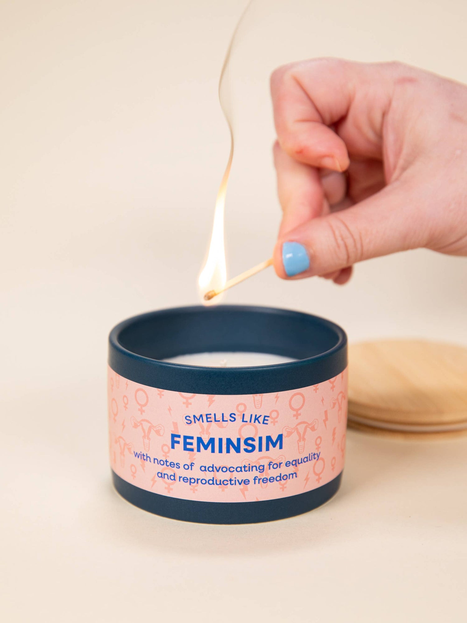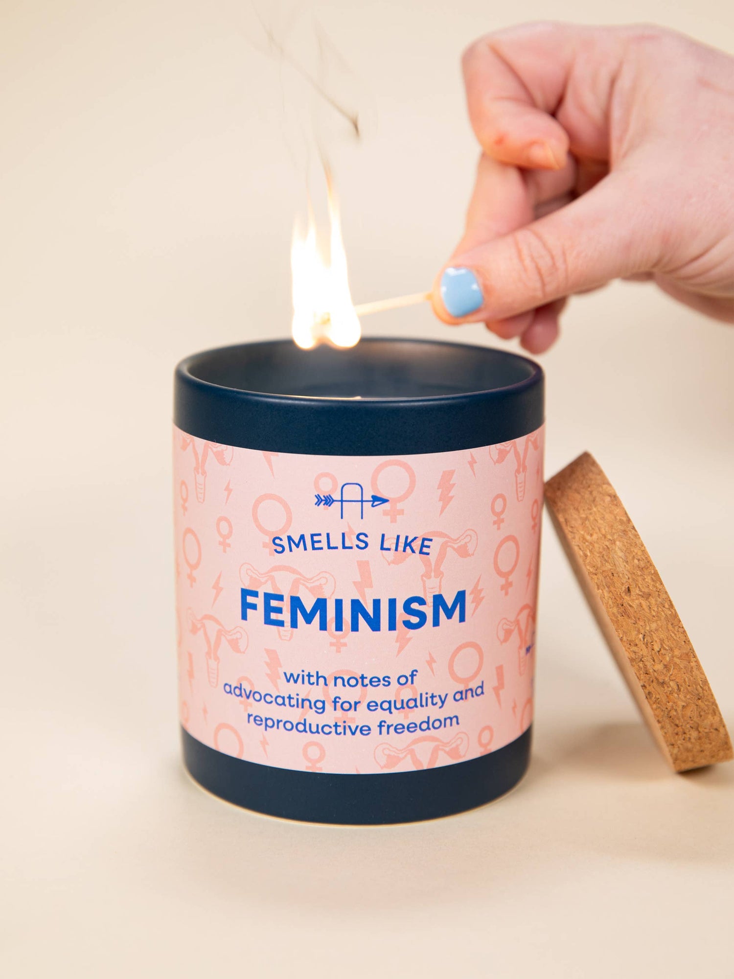 Smells Like Feminism candle, with notes of advocating for equality and reproductive freedom. Adorned with a light pink label illustrated with uteruses, lightning bolts and female symbols; housed in a dark blue modern ceramic tumbler. The perfect feminist gift for those who stand for what they believe in. Use it to add a touch of protest to any space!