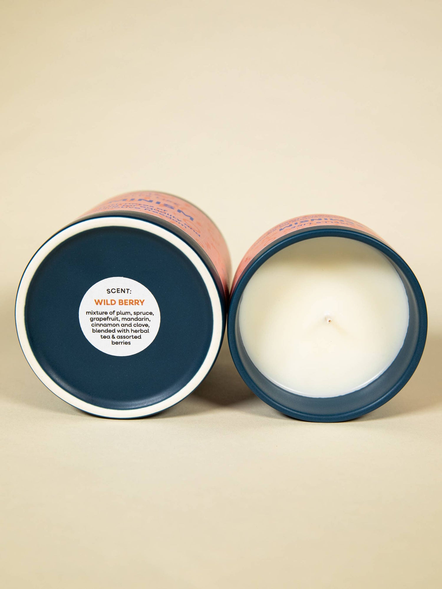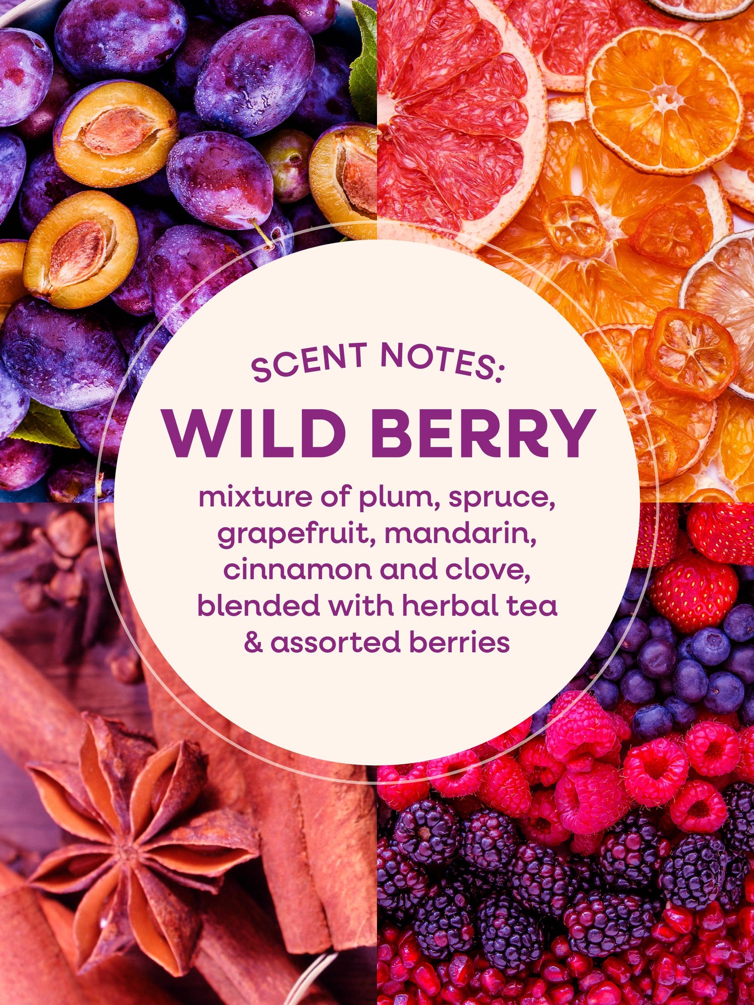 Candle scent is Wild Berry, a mixture of plum, spruce, grapefruit, mandarin, cinnamon and clove, blended with herbal tea and assorted berries. Candles include small sticker on bottom with scent notes.
