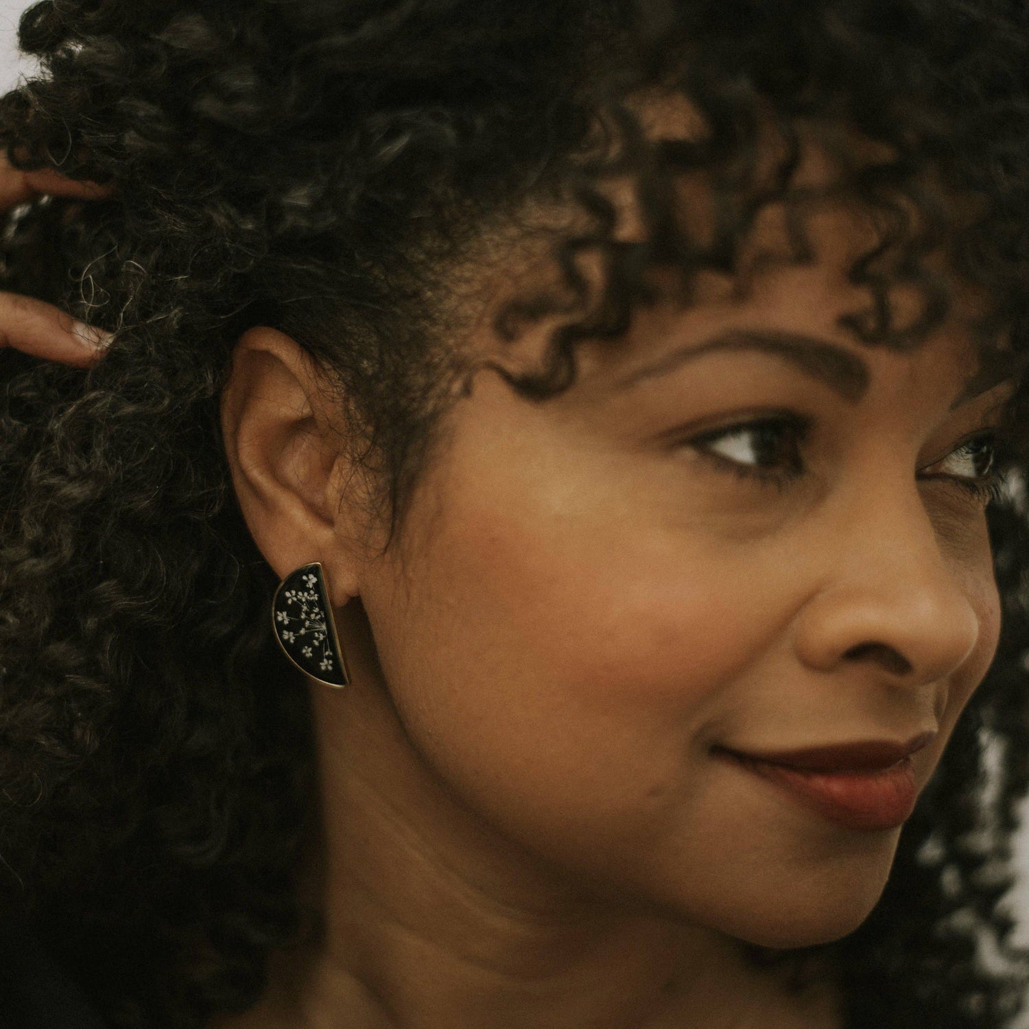 A single flower cut in half and encased inside of these slim half circle, brass frames. Available in clear with Daisy or black background with Queen Anne’s Lace.